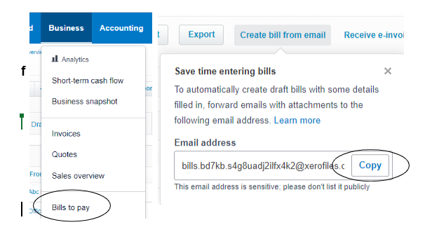 Instead of printing your invoices, email them directly to Xero! This will allow you to send invoices from your email directly to your Xero inbox, saving you time and hassle. To access your Xero email address, follow these instructions below: - Login to Xero and click on the business tab - bills to pay