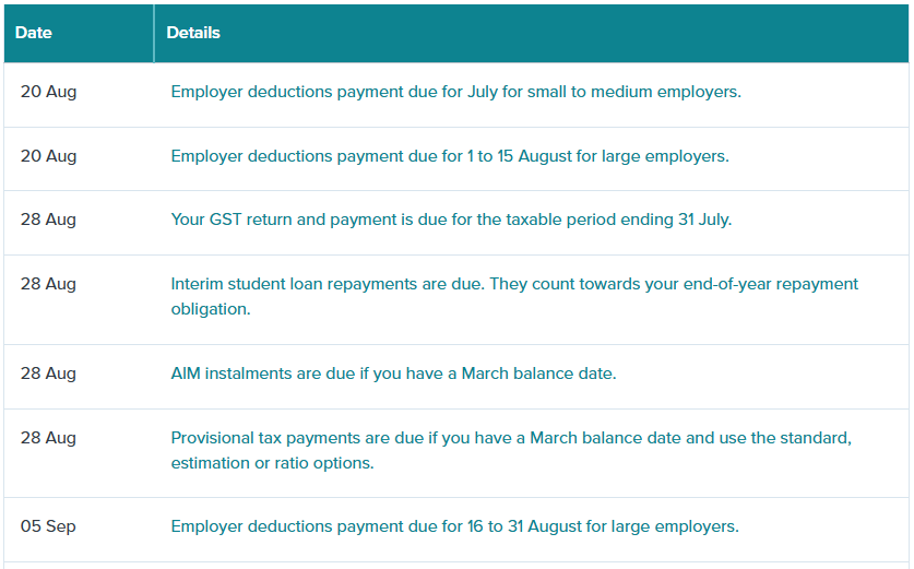 3. If in doubt, contact us: As always, we are here to help, so if you are unsure or have any concerns about your provisional tax instalment, please contact the team (admin@aafl.nz or 04-970-1182), we are more than happy to discuss your situation. July GST - Due 28 August 2025 A reminder that GST for periods ending 31 July 2025 is also due for payment on 28 August 2025 |