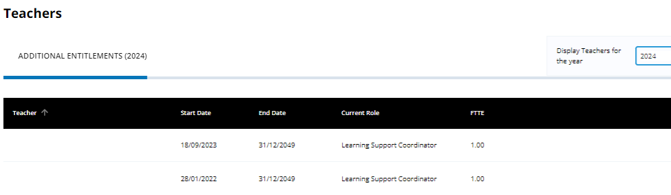 In Pourato, you can review the components of your additional staffing entitlements, and it's advisable to do this before the end of the year to ensure the accuracy of start and end dates and allocated FTTE, especially for beginning teachers. We've identified several incorrect entries and noted that some schools are missing FTTEs. To locate the screen, log in to Pourato and click on the 'Teachers' tab. You can adjust the year on the right-hand side. |