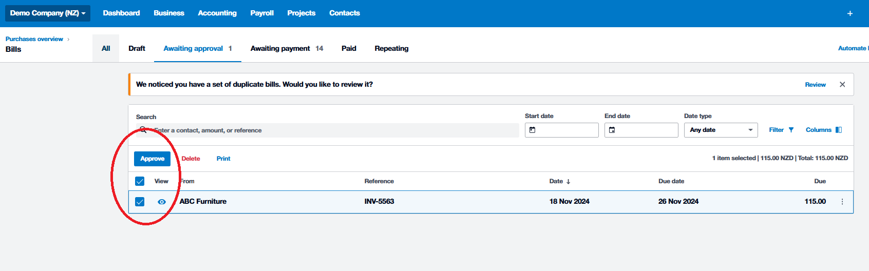 To approve a bill, go to the "Awaiting Approval" tab, select the bill/s you want to approve by ticking the box on the left-hand side, then click the 'Approve' button. |