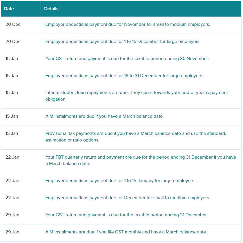 We have sent the majority of the provisional tax payment reminder letters relating to the second provisional tax amount for the year ended 31 March 2024, which is due 15 January 2024. If you were expecting a provisional tax reminder and have not received one, or if you have any questions around the payment reminder letter received, please contact the team (admin@aafl.nz or 04-970-1182). Also a reminder that GST for the period ended 30 November 2023 is also due 15 January 2024. Again we have sent out the majority of the GST returns for November 2023, with the final few to be sent this week. So make sure you factor in the cashflow required for both taxes and for staff wages through the festive season. If you need an instalment arrangement or extension put in place for the provisional tax or GST, please contact us this week. |