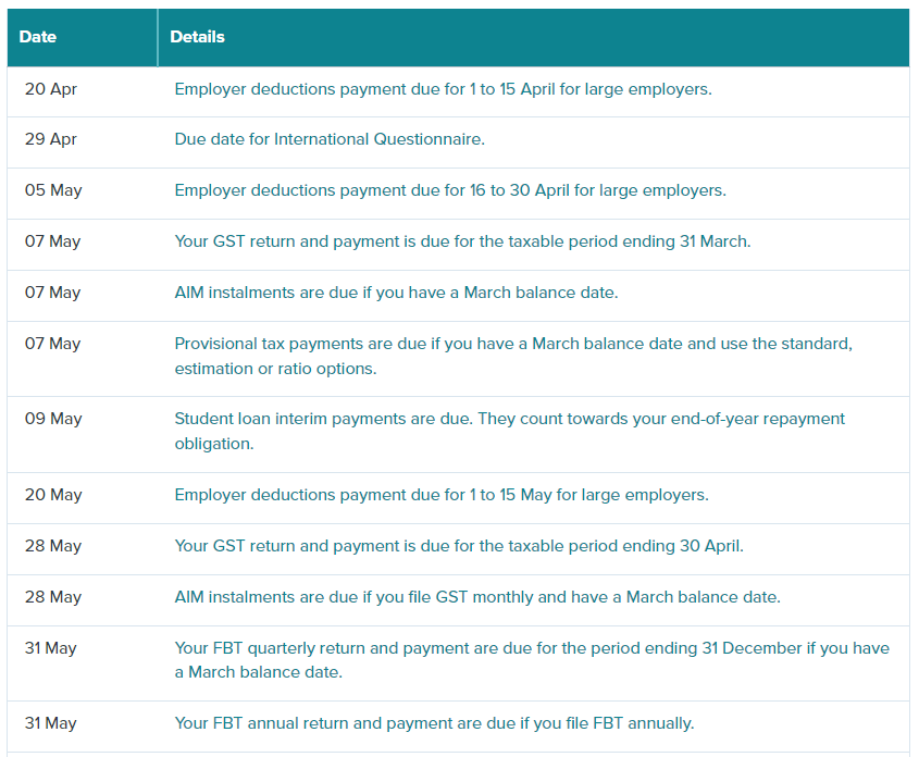 IRD UPCOMING TAX PAYMENT DATES