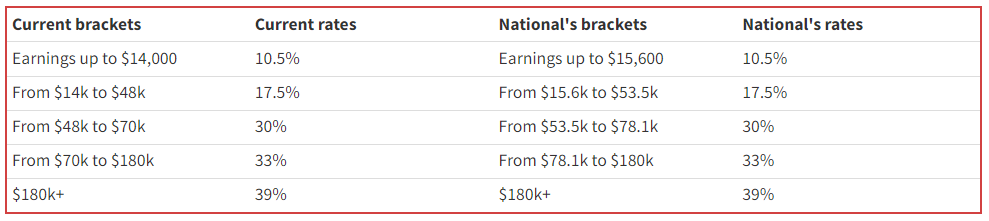Tweaks to tax brackets National has proposed changes to tax brackets, designed to adjust for inflation and boost incomes: |