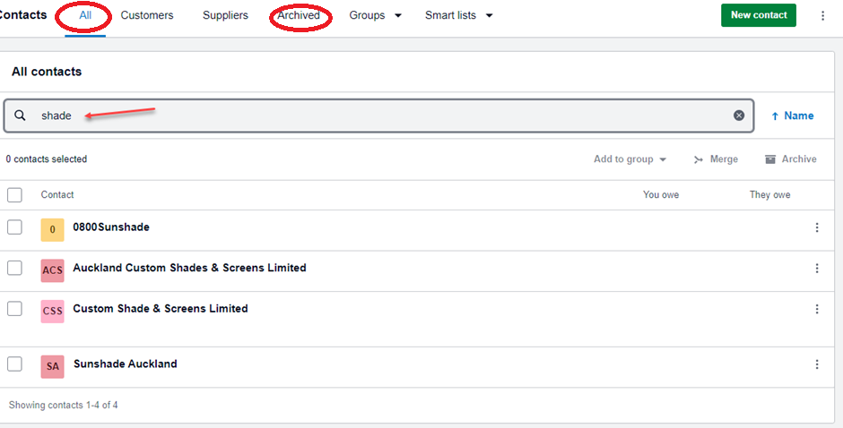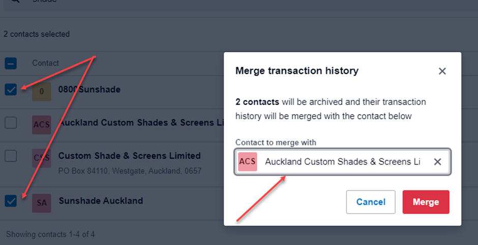 4. Click Merge, then click Confirm merge. The merged contacts will be archived and all associated transactions will be merged into the activity details of the contact you keep.